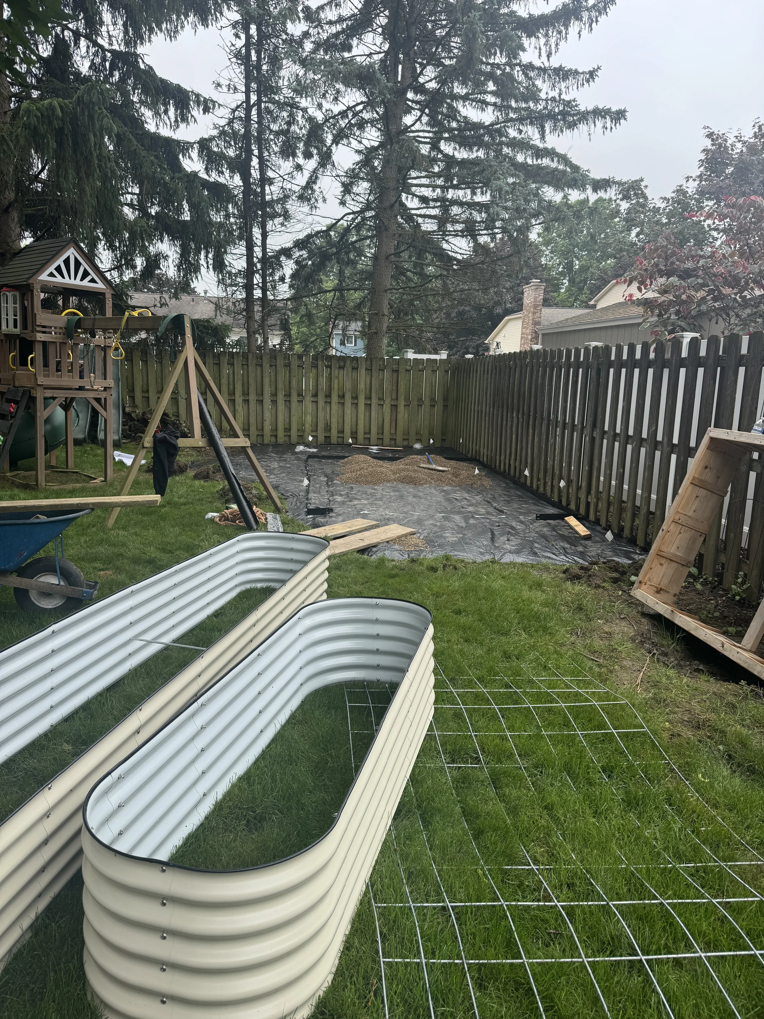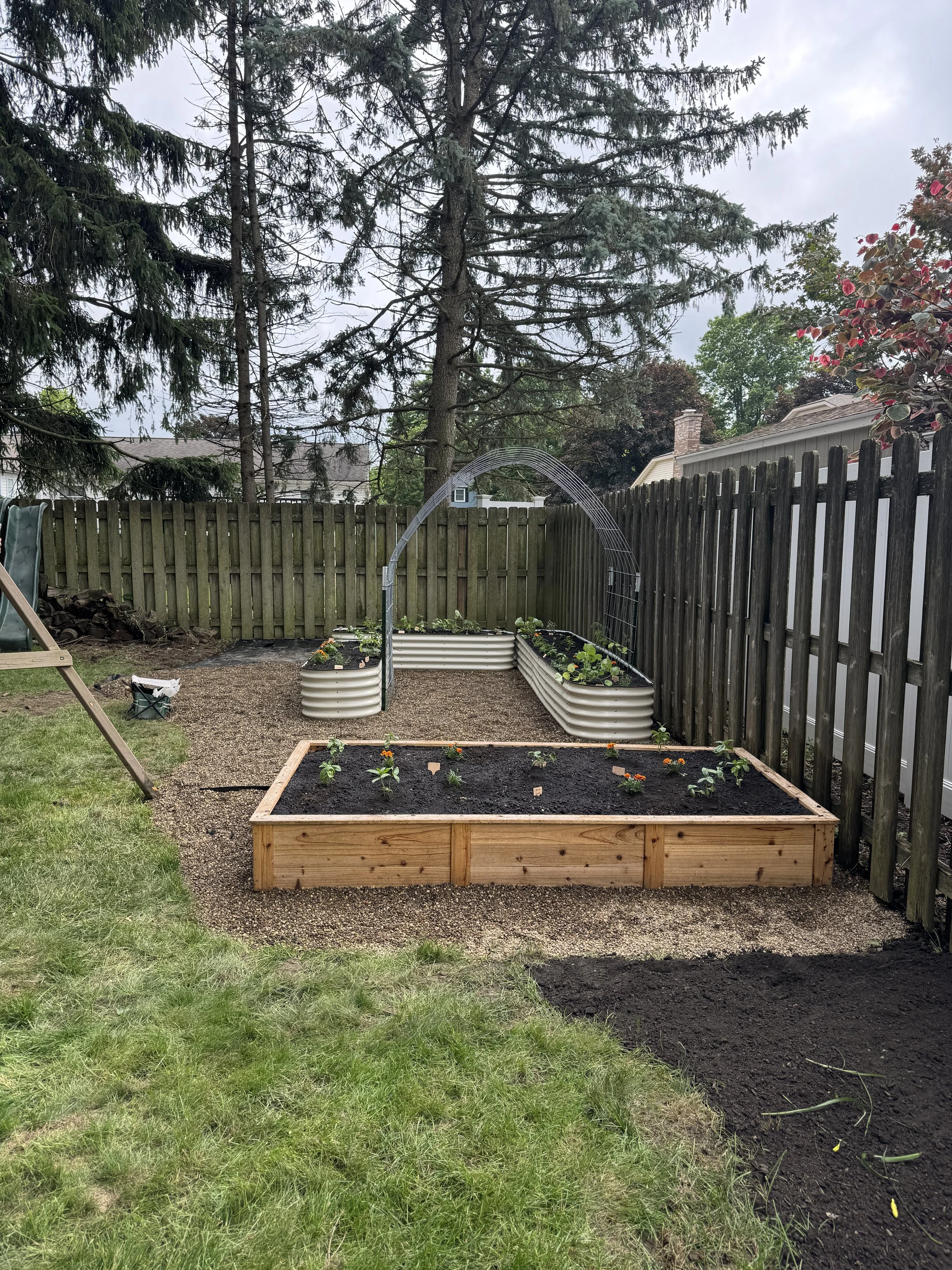 With most of their yard shaded, we identified the only viable sunny spot: just beyond the playset. It became the perfect location—visible, accessible, and playful—for their future garden memories. The 10’ x 17’ space now includes: